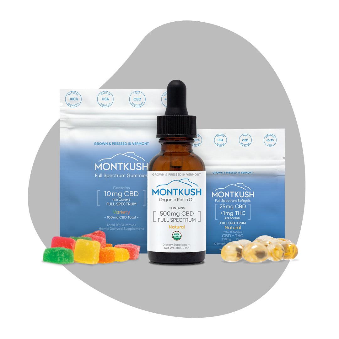 The MONTKUSH Relax & Revive Bundle includes your choice of 500mg CBD oil (Natural, Mint, or raw CBDA oil), a 10-count packet of our CBD gummies, and a 10-count packet of our CBD softgels.